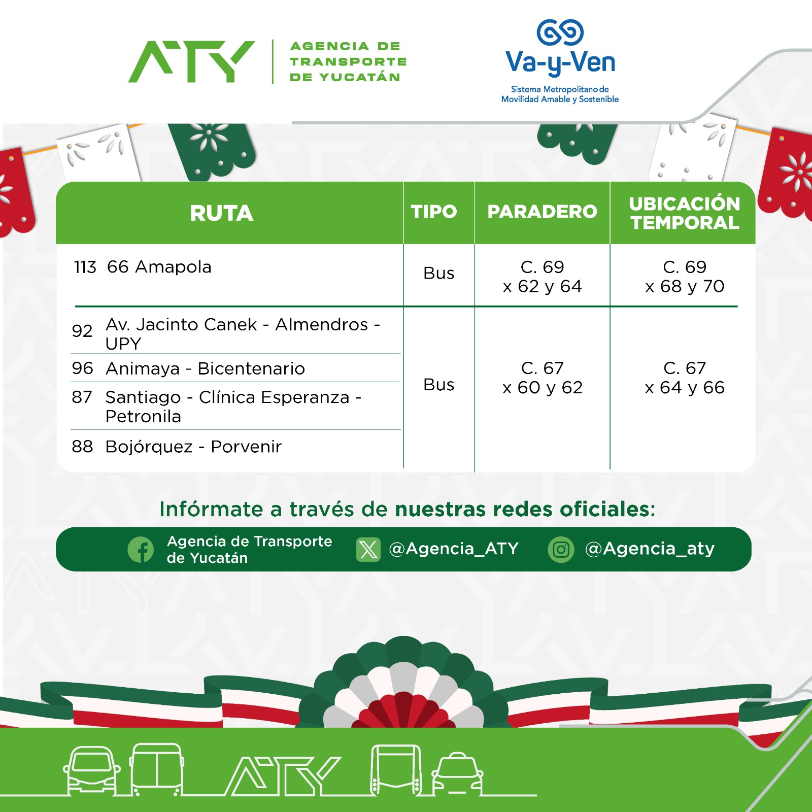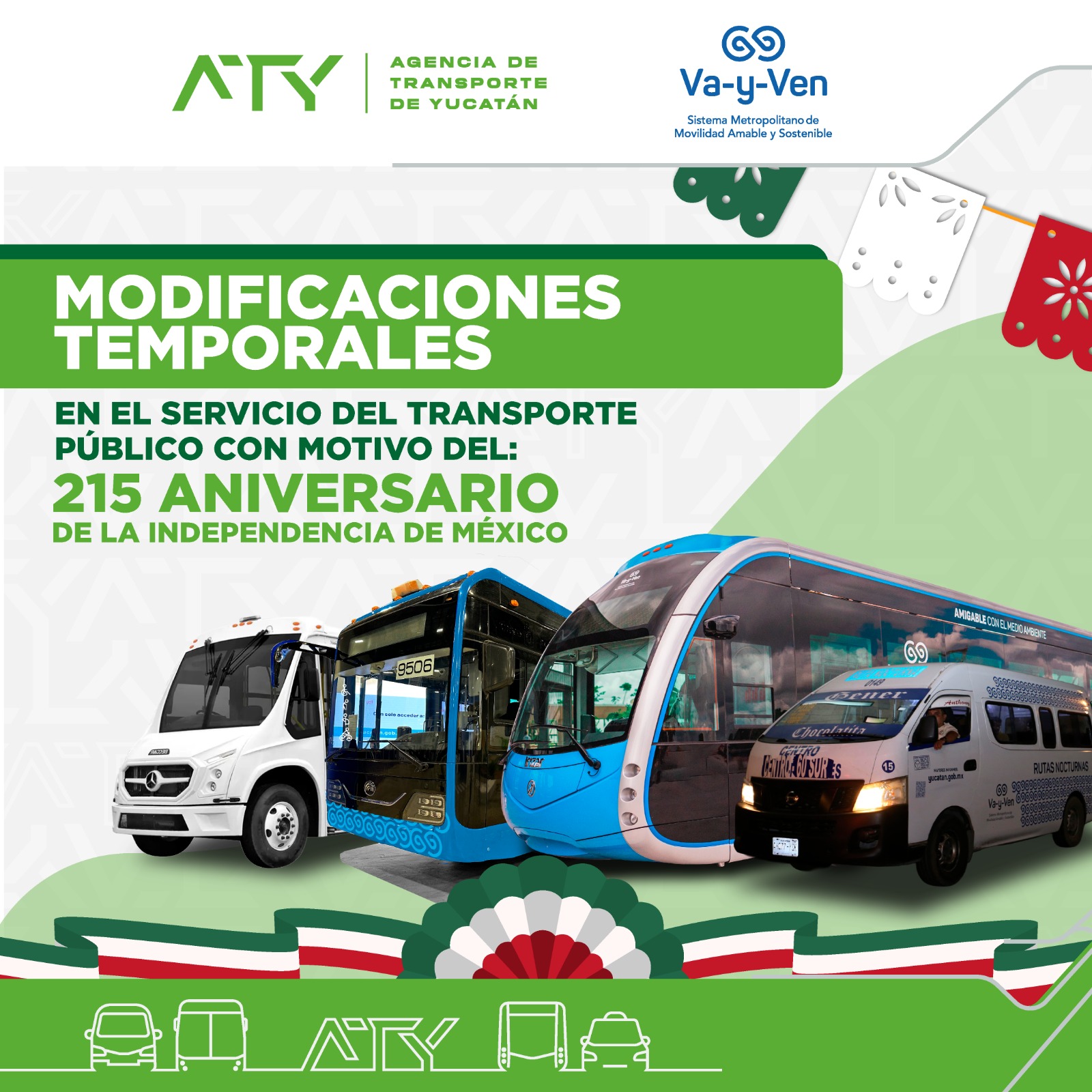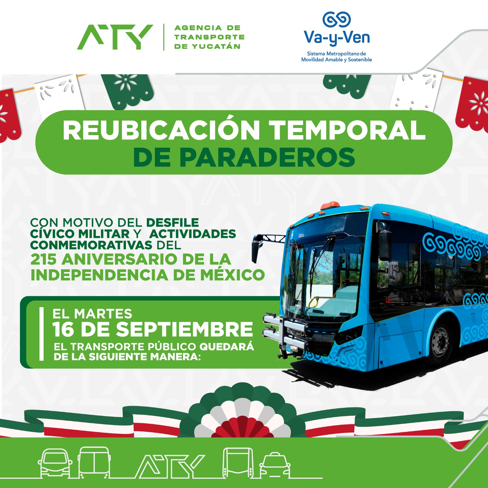 Mérida, Yucatán, 12 de septiembre de 2025.- La Agencia de Transporte de Yucatán (ATY) anunció la extensión de horarios del servicio de transporte público y la reubicación temporal de paraderos en el Centro Histórico de Mérida, con motivo de las celebraciones por el 215 aniversario del Grito de Independencia.