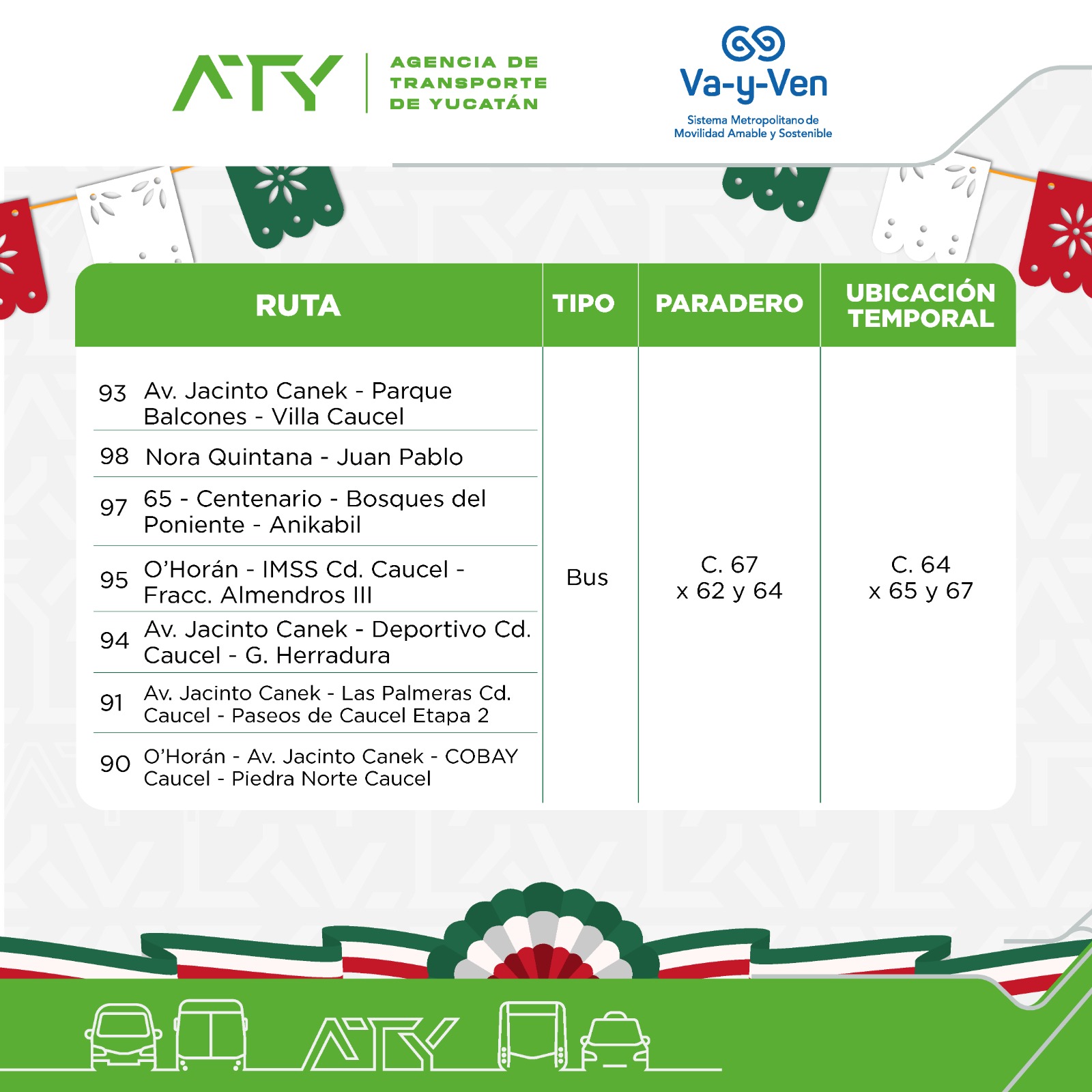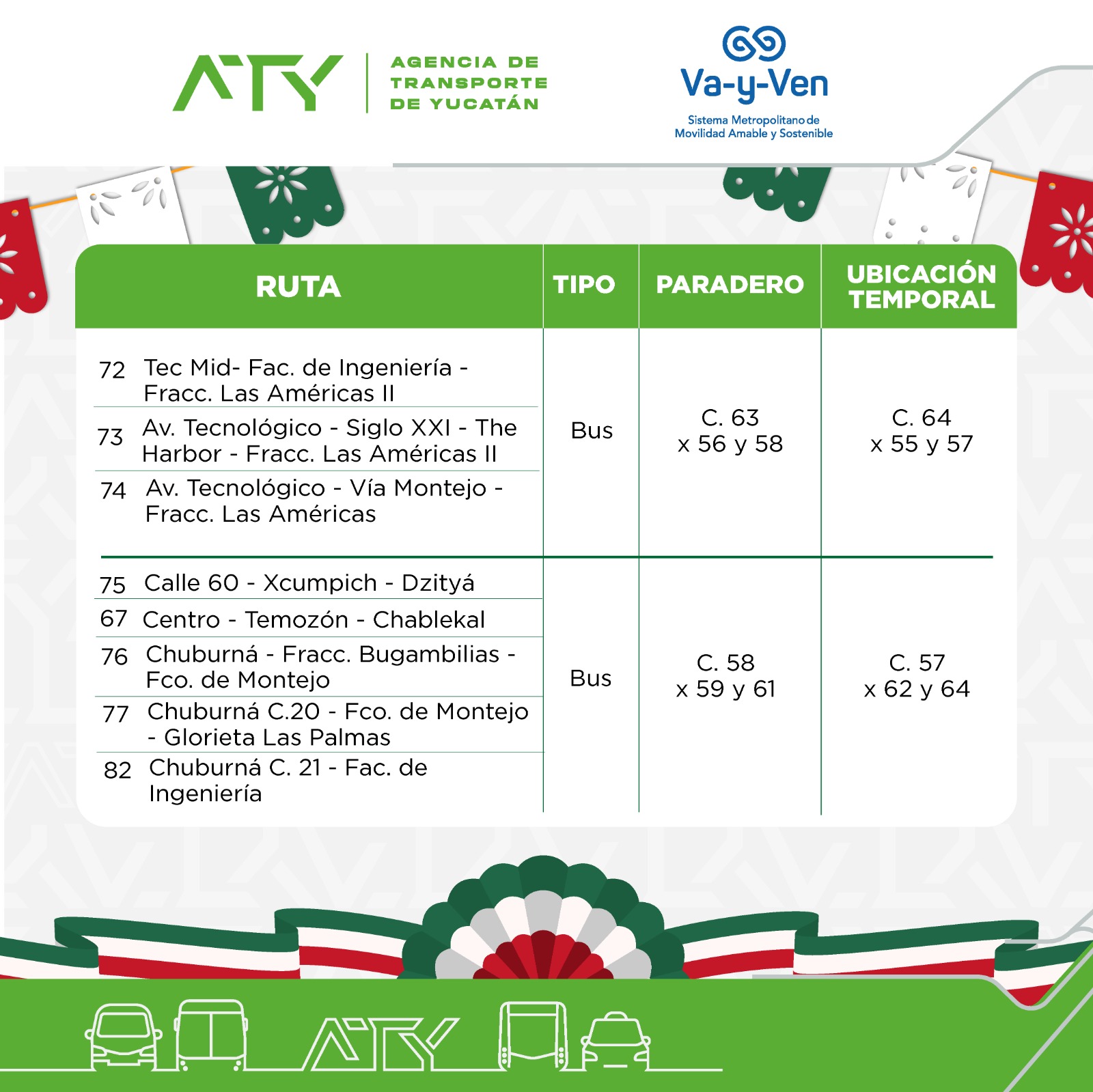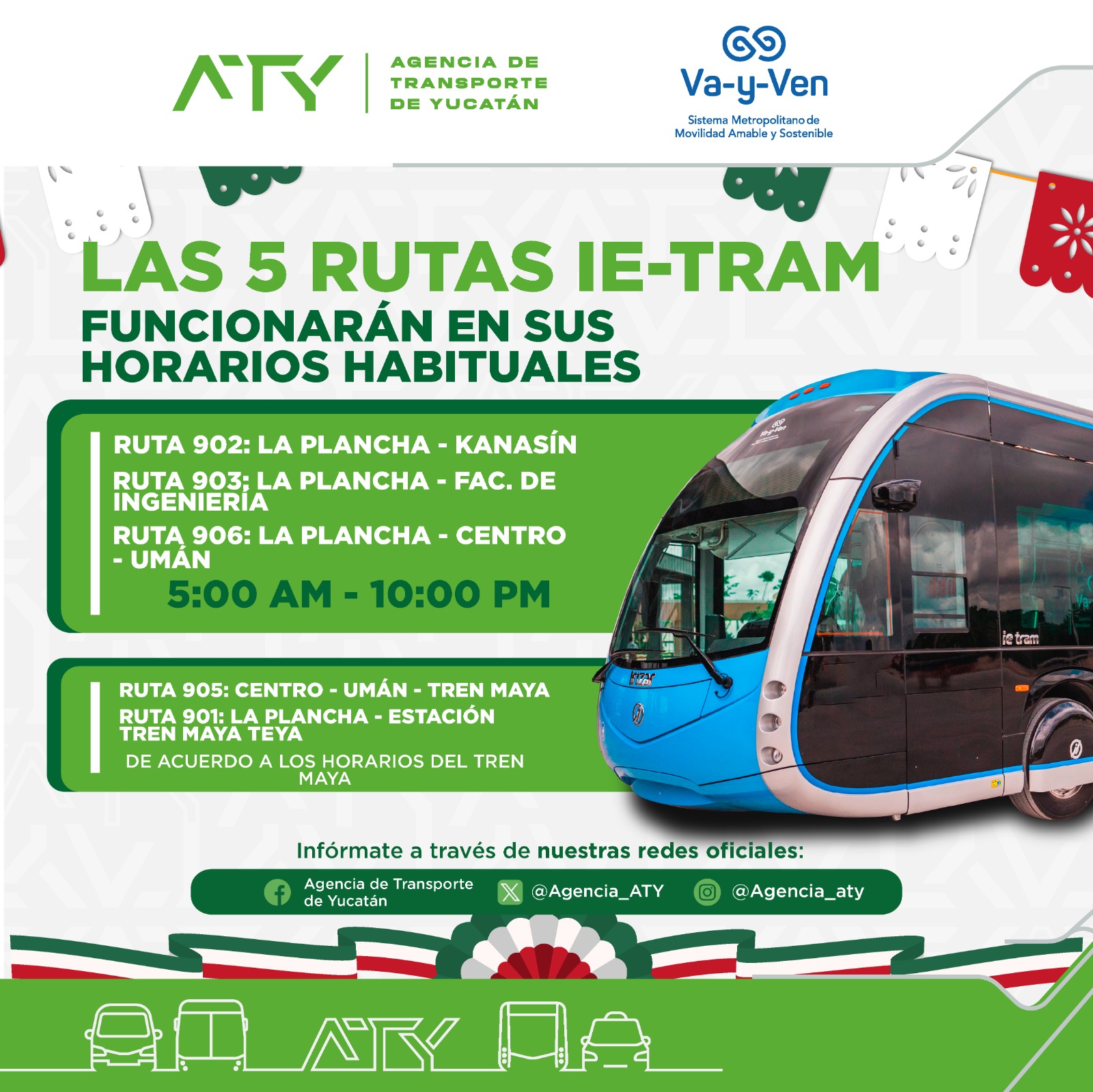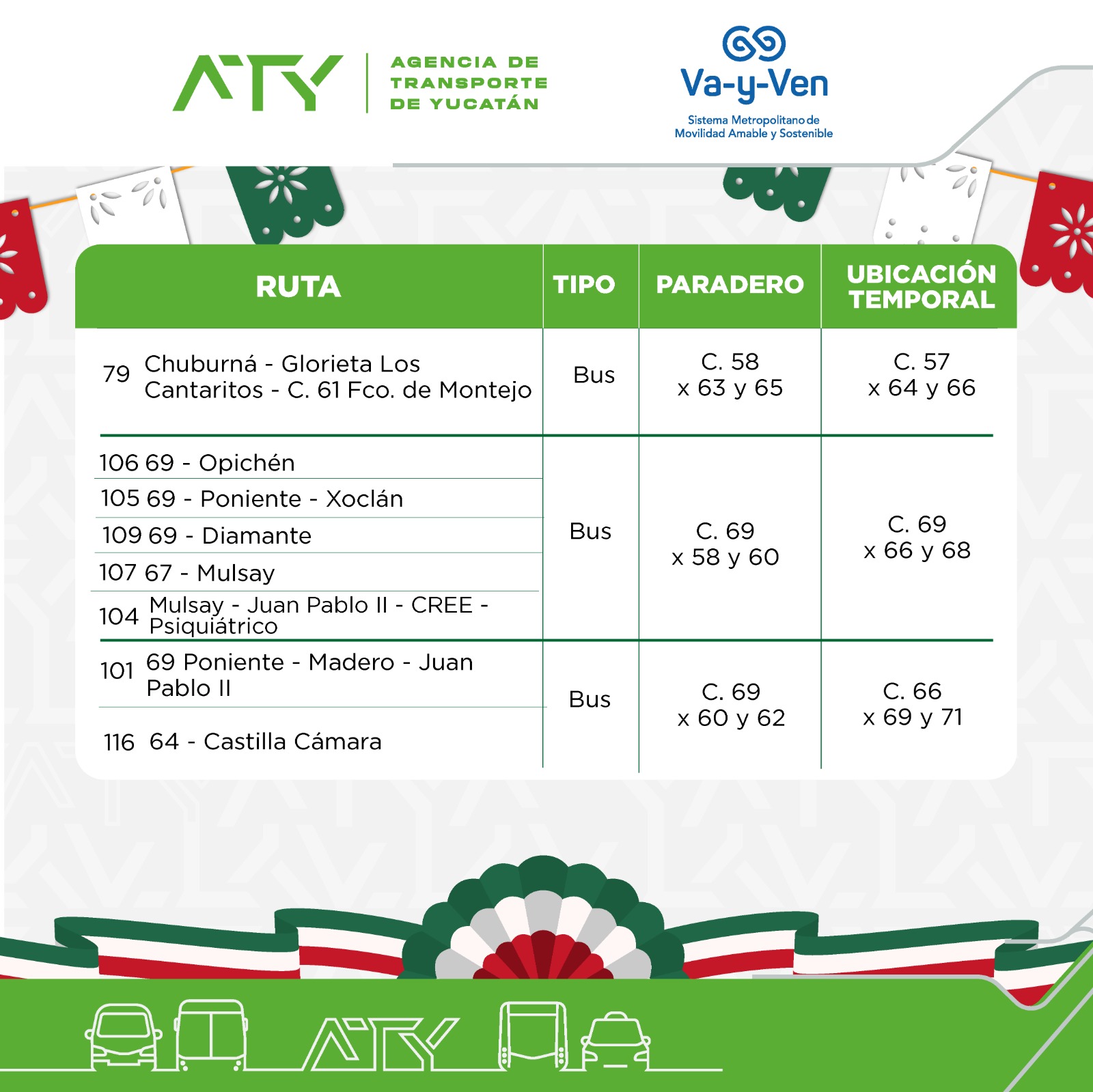 Mérida, Yucatán, 12 de septiembre de 2025.- La Agencia de Transporte de Yucatán (ATY) anunció la extensión de horarios del servicio de transporte público y la reubicación temporal de paraderos en el Centro Histórico de Mérida, con motivo de las celebraciones por el 215 aniversario del Grito de Independencia.
