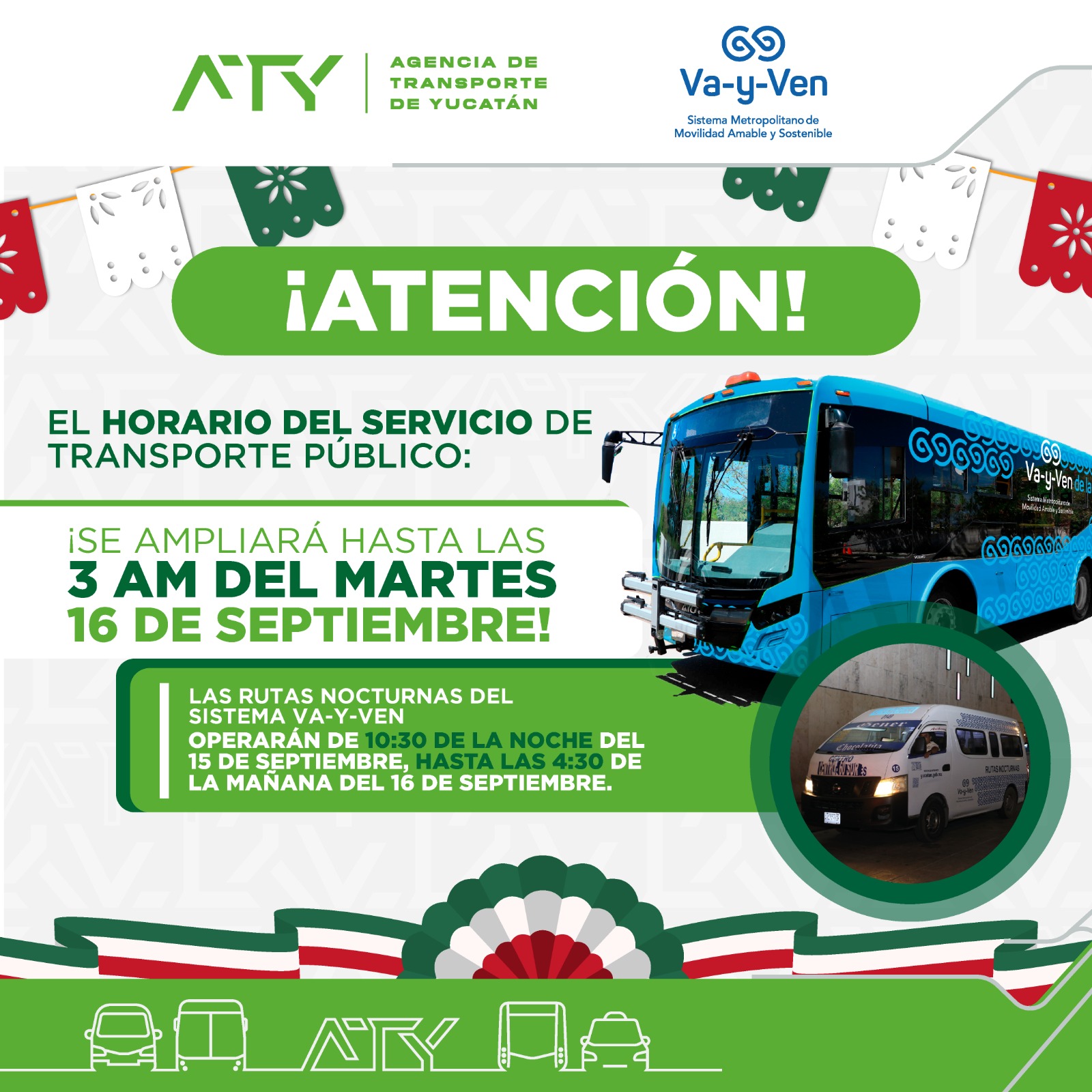El servicio de las rutas del sistema Va y Ven y del transporte convencional se ampliará hasta las 3:00 de la mañana del martes 16, mientras que las rutas nocturnas mantendrán su operación habitual de 10:30 p.m. a 4:30 a.m.