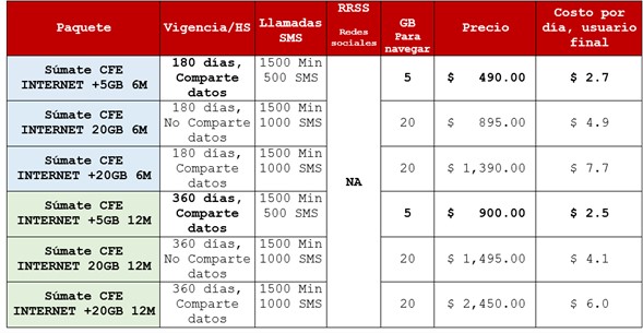 Por lo anterior, se adicionan a su oferta comercial siete paquetes que ofrecen llamadas y SMS ilimitados entre líneas CFE Internet, además de las siguientes redes sociales ilimitadas: Facebook, Messenger, Instagram, X (antes Twitter), WhatsApp, Telegram y Snapchat.