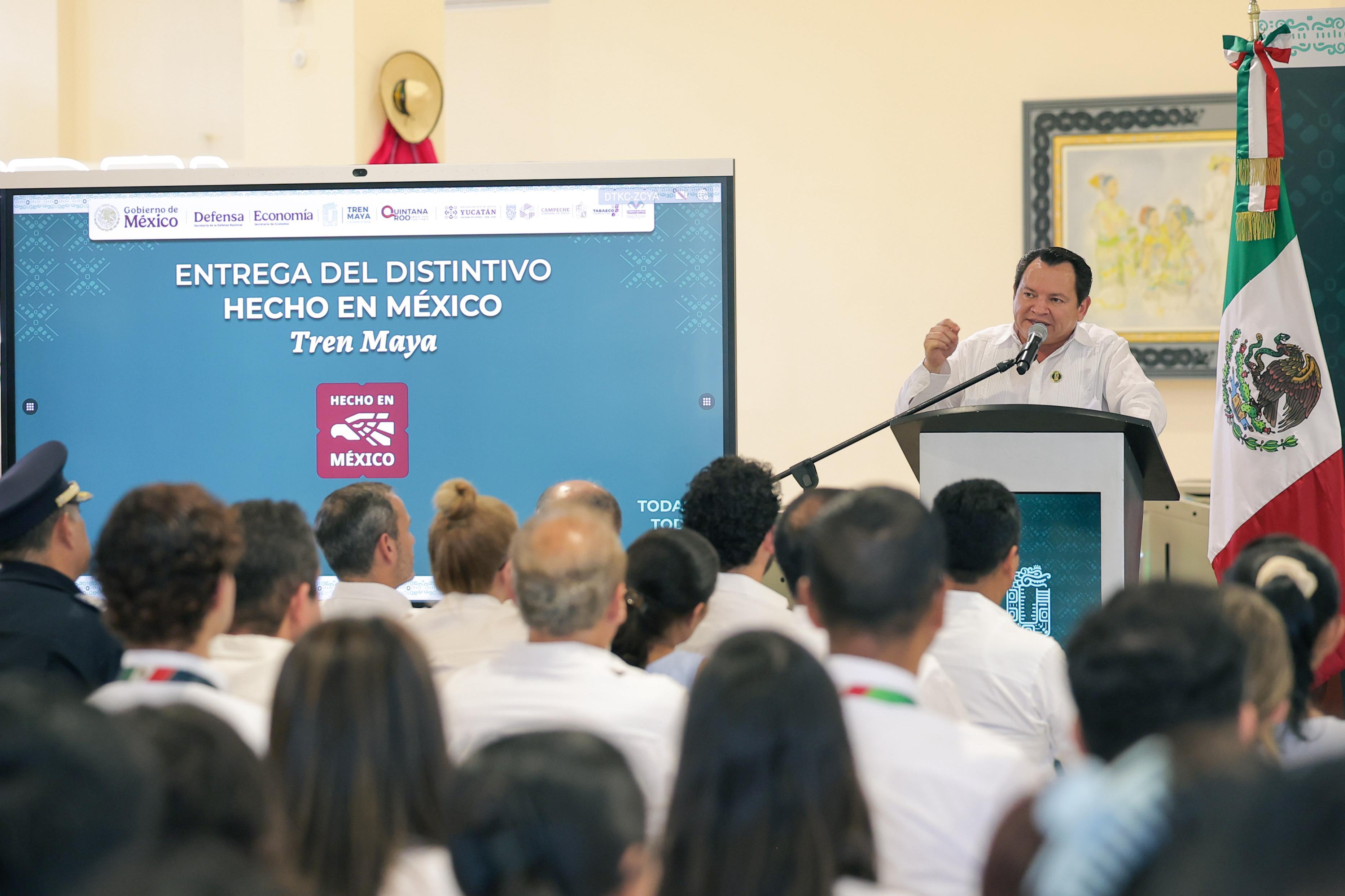 Mérida, Yucatán, 12 de septiembre de 2025.– El Gobernador Joaquín Díaz Mena atestiguó la entrega del distintivo “Hecho en México” al Tren Maya, otorgado por la Secretaría de Economía como reconocimiento a una obra ferroviaria construida con talento y manos mexicanas.