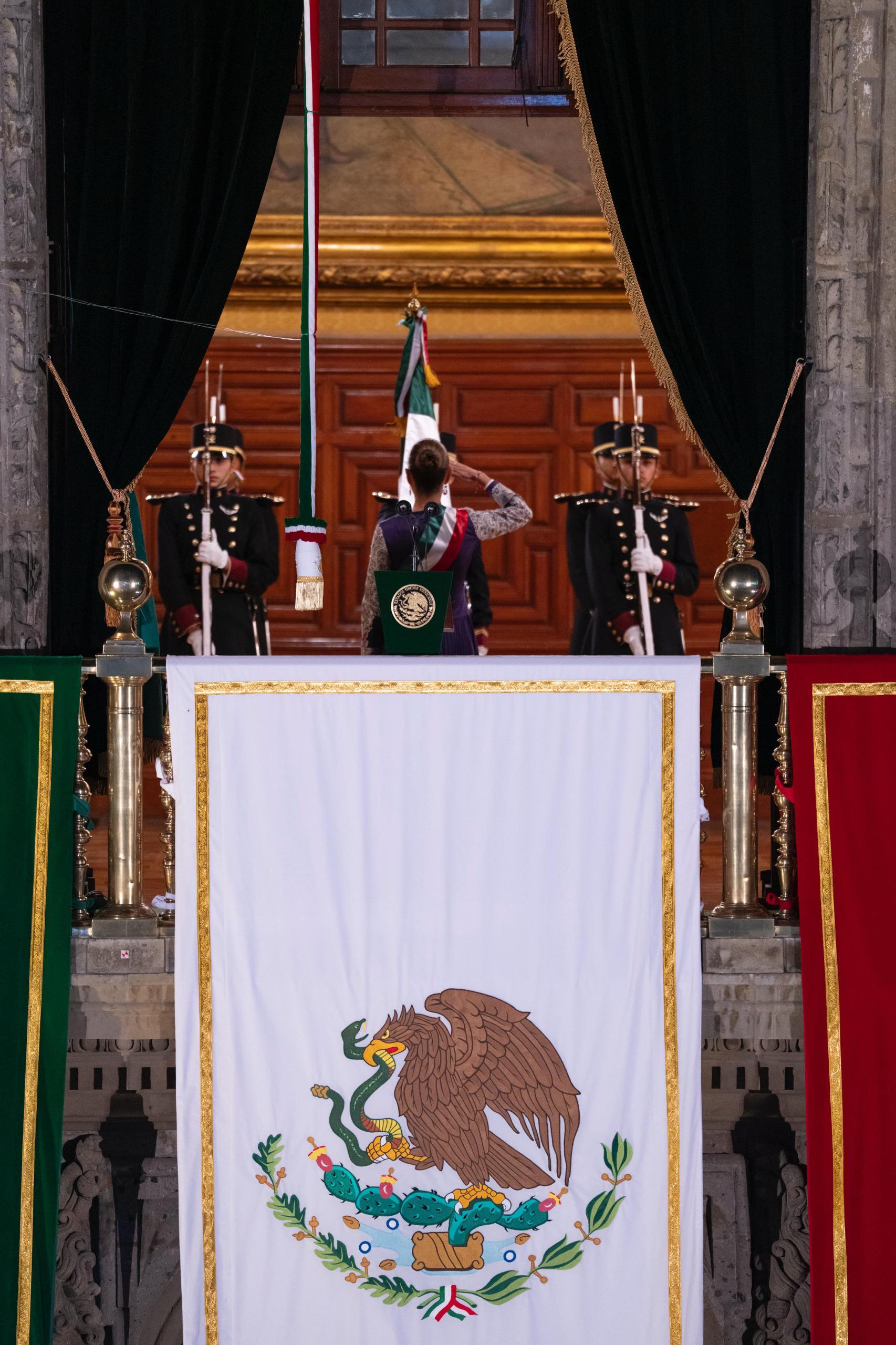 Un hecho histórico marcó la noche: la bandera nacional fue entregada a la Presidenta por primera vez en la historia de manos de una escolta integrada exclusivamente por mujeres militares del Heroico Colegio Militar.