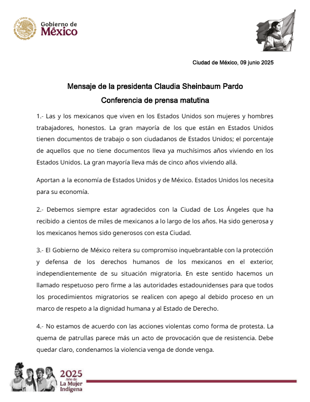 Ciudad de México, 10 de junio de 2025 — Ante las recientes redadas migratorias en Los Ángeles, Estados Unidos, la presidenta de México, Claudia Sheinbaum Pardo, fijó una postura firme: “Por encima de todo, respeto a los derechos humanos”.