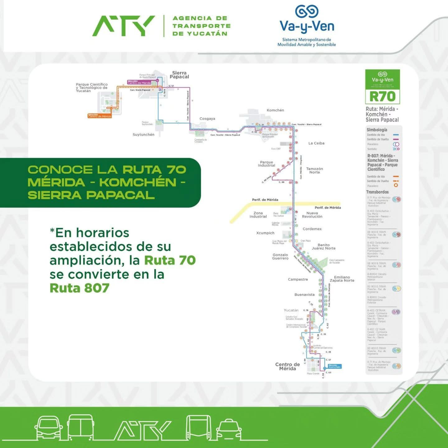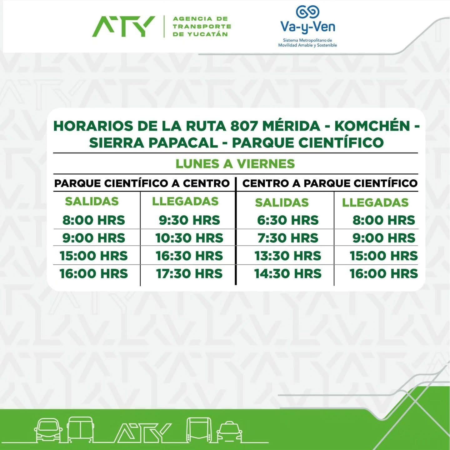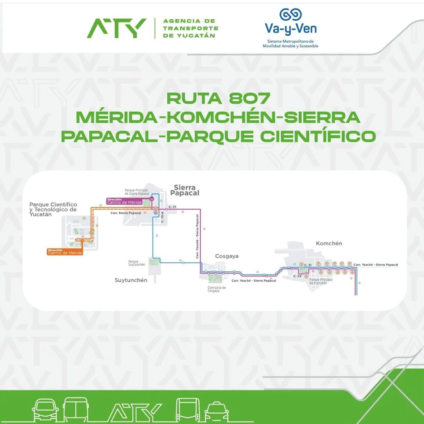 Ruta 807, derivada de la Ruta 70, que enlazará el Centro de Mérida con el Parque Científico Tecnológico de Yucatán, operando de lunes a viernes.