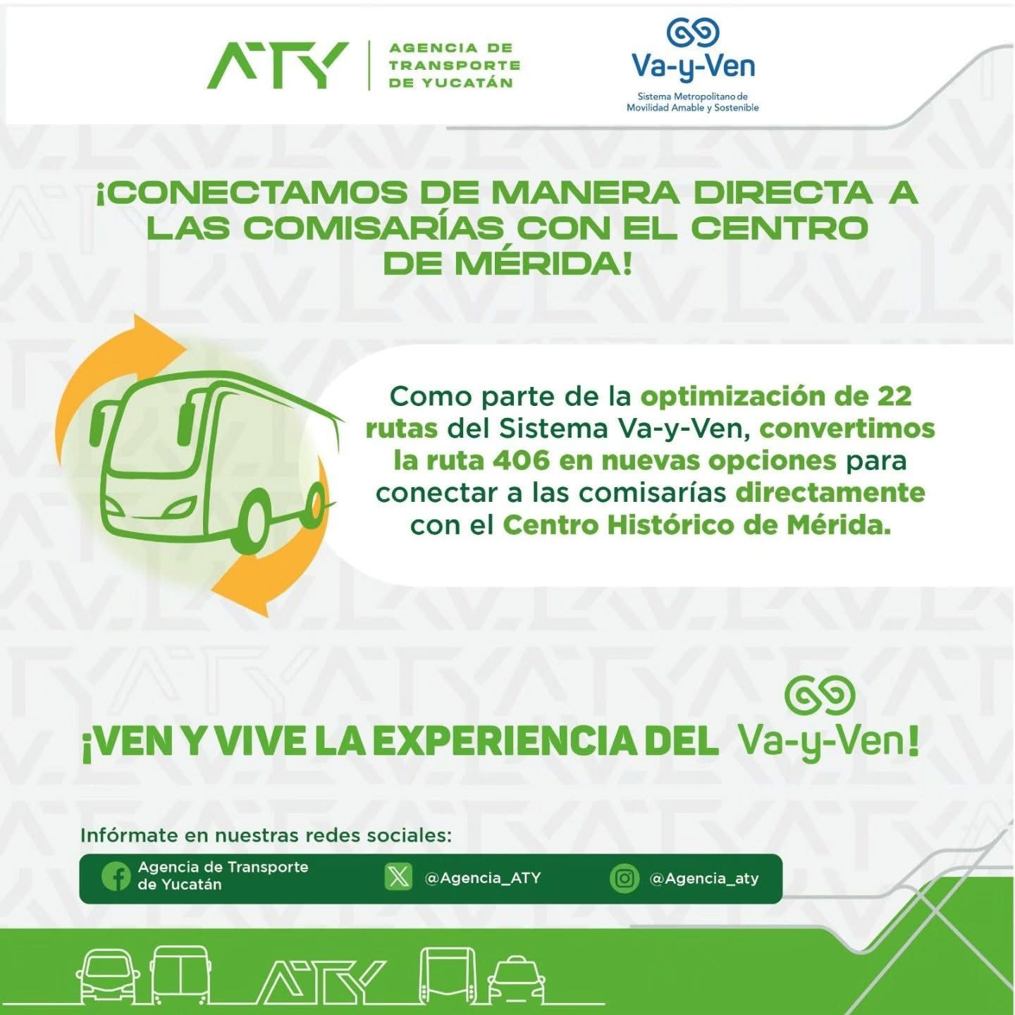 Mérida, Yucatán, 11 de junio de 2025. – La Agencia de Transporte de Yucatán (ATY) anunció una reestructuración estratégica de la Ruta 406 del Sistema Va y Ven, que a partir del viernes 13 de junio se transformará en dos rutas troncales: Ruta 70 Francisco de Montejo – Centro y Ruta 71 Centro – Parque Industrial, con el objetivo de mejorar la conectividad hacia comisarías del norte de Mérida como Komchén, Cosgaya y Sierra Papacal, así como hacia el Parque Científico, Kikteil y Dzidzilché.