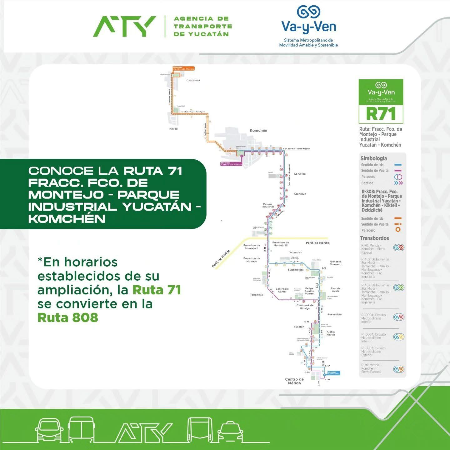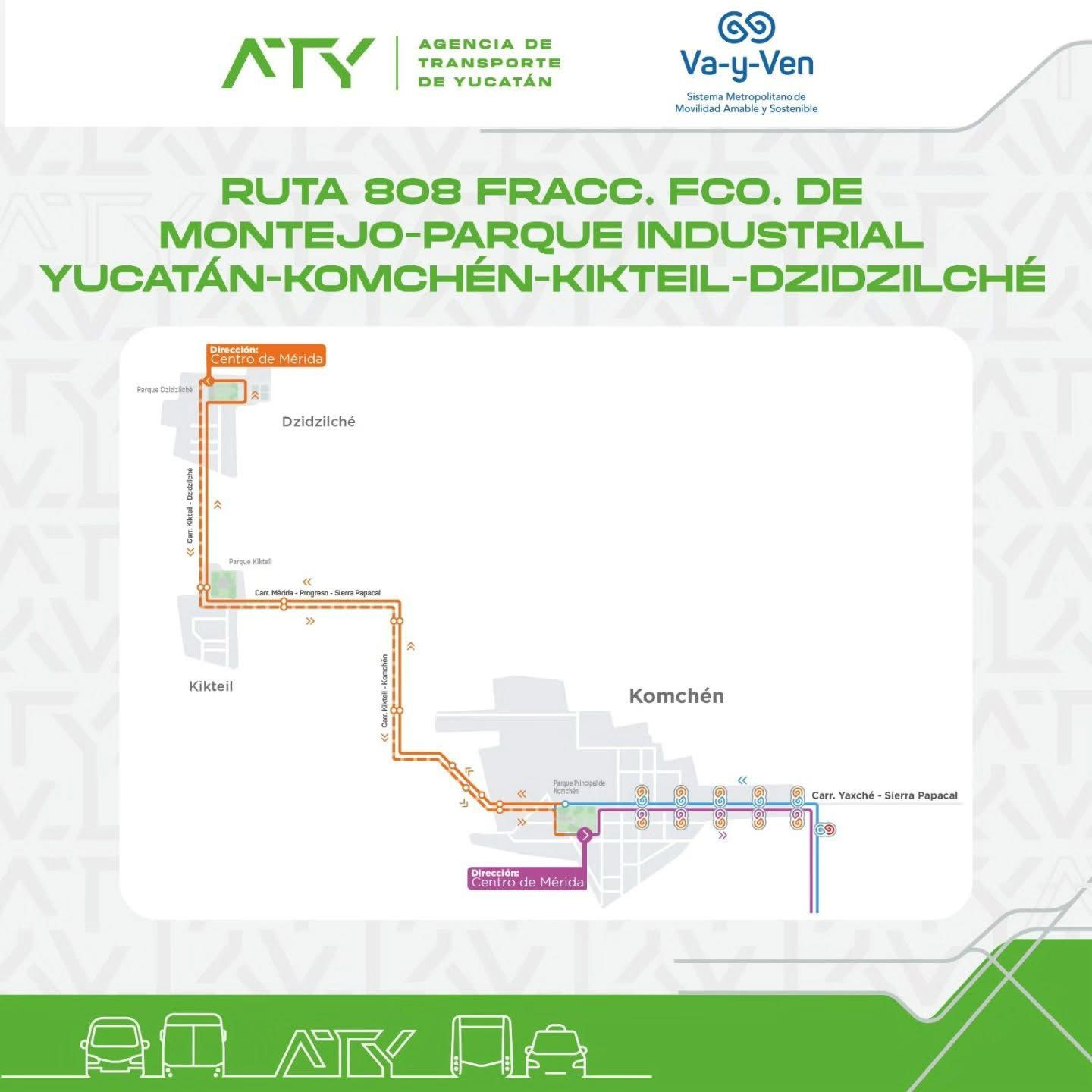 Ruta 808, extensión de la Ruta 71, que llegará a Kikteil y Dzidzilché, con horarios amplios de lunes a domingo, incluyendo servicio nocturno hasta las 22:40 horas.