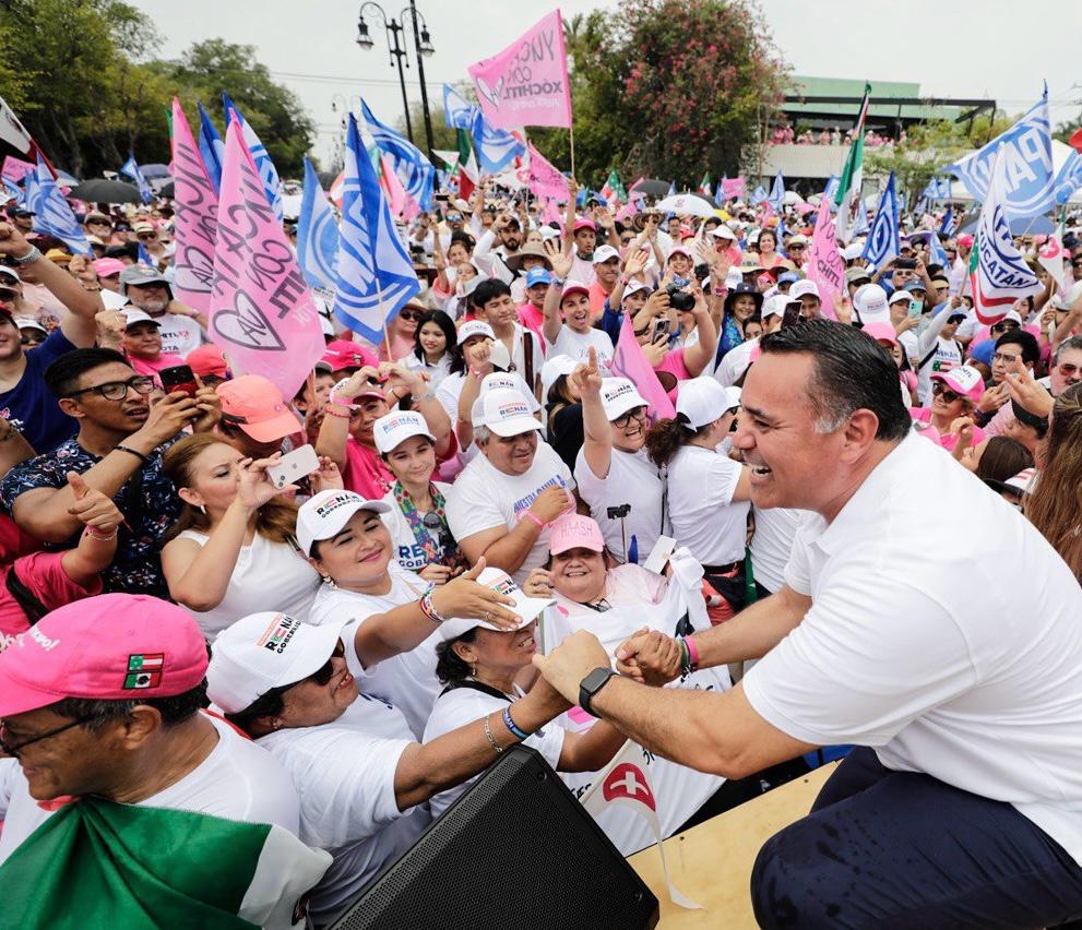 Mérida, Yucatán a 19 de mayo de 2024.- “Lo decimos fuerte y claro, Morena no pasará en Yucatán, ¡vamos a salir a votar! En dos domingos más vamos a celebrar la libertad y la democracia con Xóchitl Gálvez como presidenta de México”, afirmó el candidato común a la gubernatura de Yucatán por el PAN, PRI y Nueva Alianza, Renán Barrera Concha, en mitin realizado en el Monumento a la Patria, como parte de la movilización nacional promovida por organizaciones de la sociedad civil en busca de incentivar la participación de la ciudadanía en las votaciones del próximo 2 de junio.