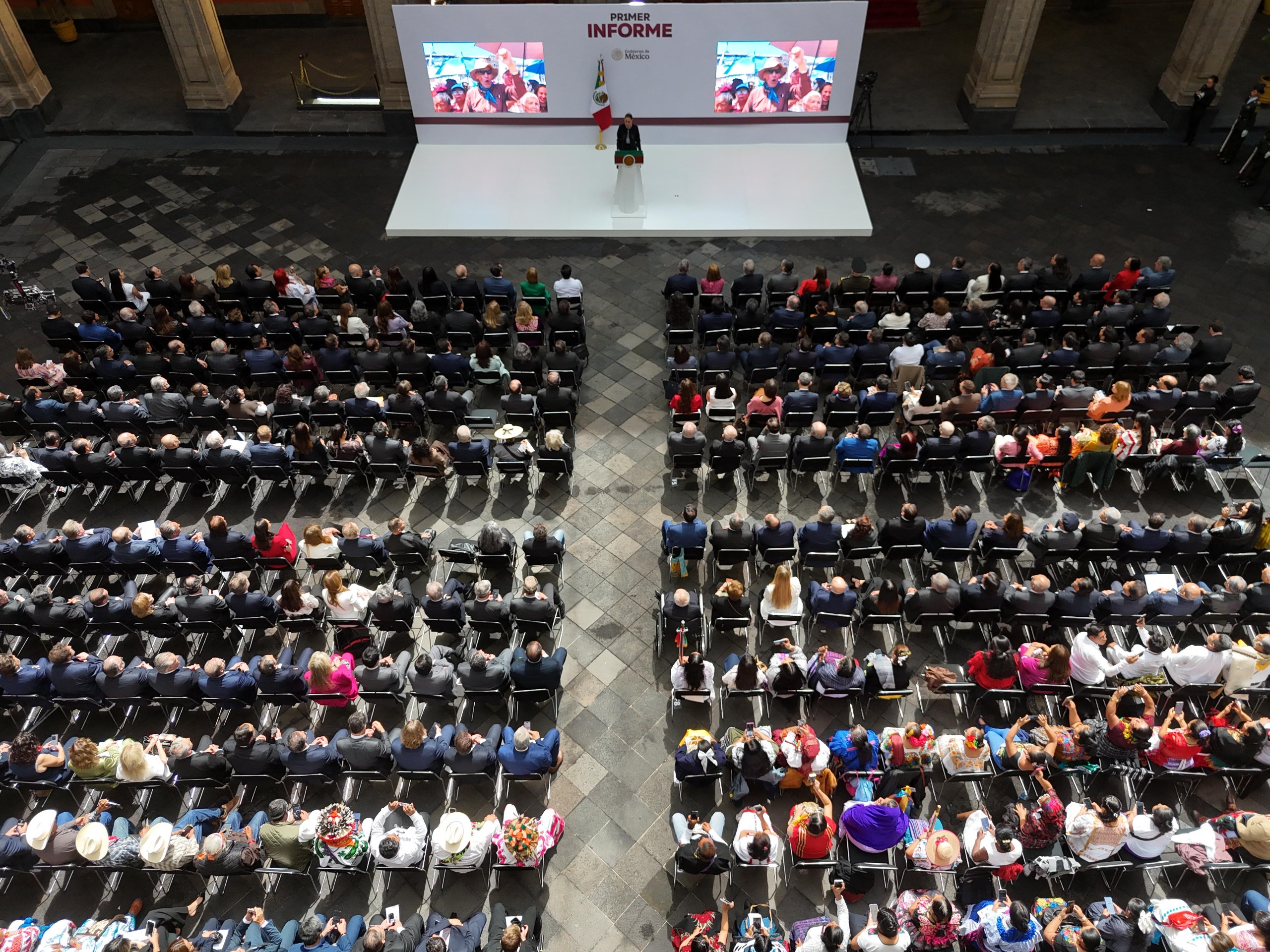 La mandataria enfatizó que, en once meses, los programas de Bienestar alcanzan a 32 millones de familias, se puso en marcha el plan Salud Casa por Casa y la Pensión Mujeres Bienestar. En seguridad, informó que los homicidios dolosos disminuyeron 25% y los feminicidios 34%.
